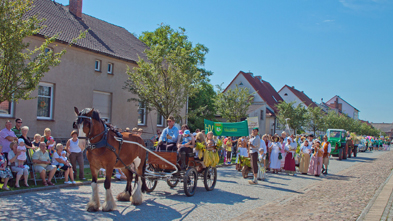 Die Schalmeienfüchse aus Petershagen stimmen die Gäste dann auf ein unterhaltsames Nachmittagprogramm ein. Es beginnt um 13:30 Uhr mit der Aufführung von bekannten Szenen aus dem Buch „Die Heiden von Kummerow“ von Ehm Welk, die Kinder aus Biesenbrow und Umgebung darstellen.