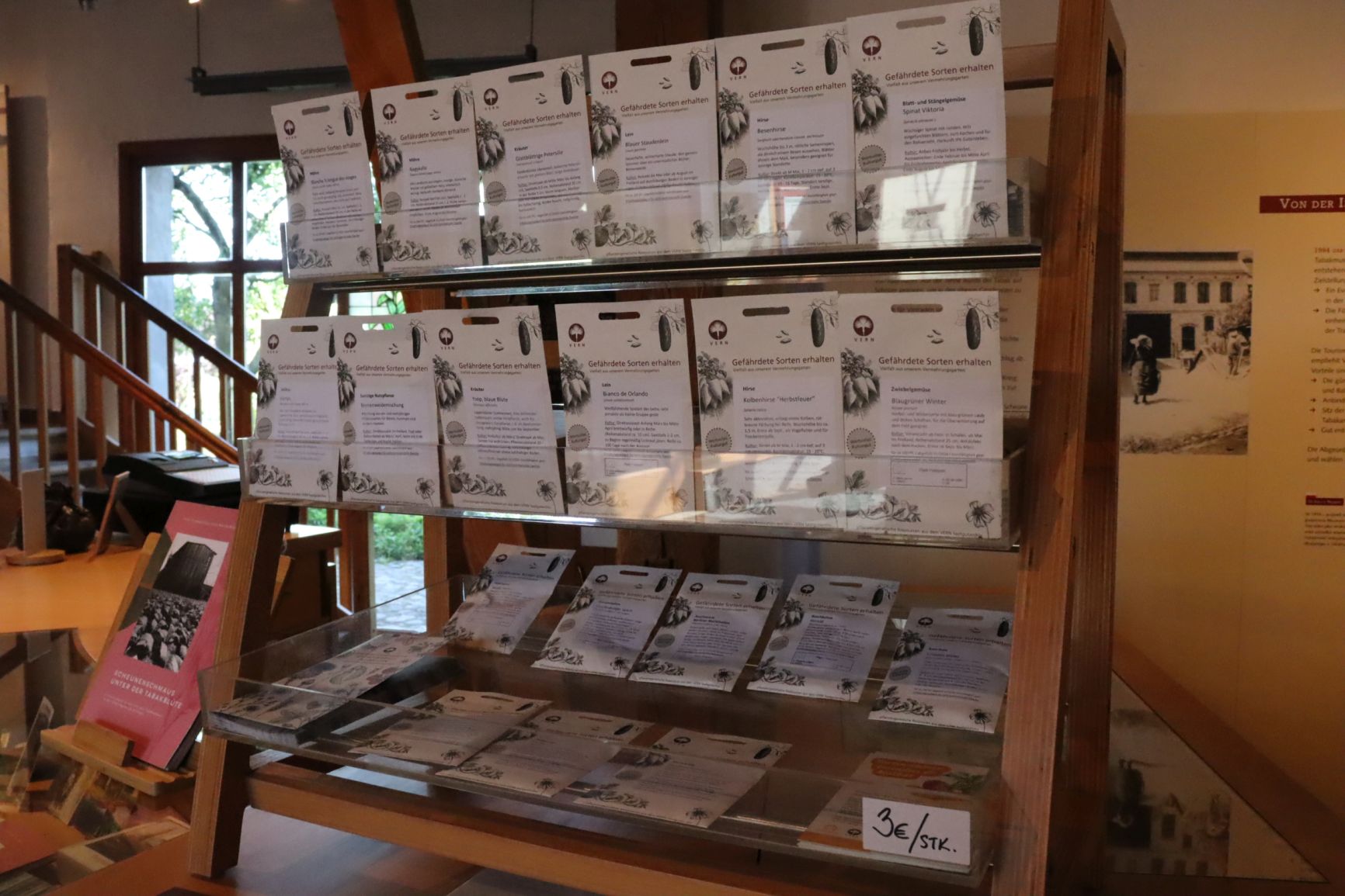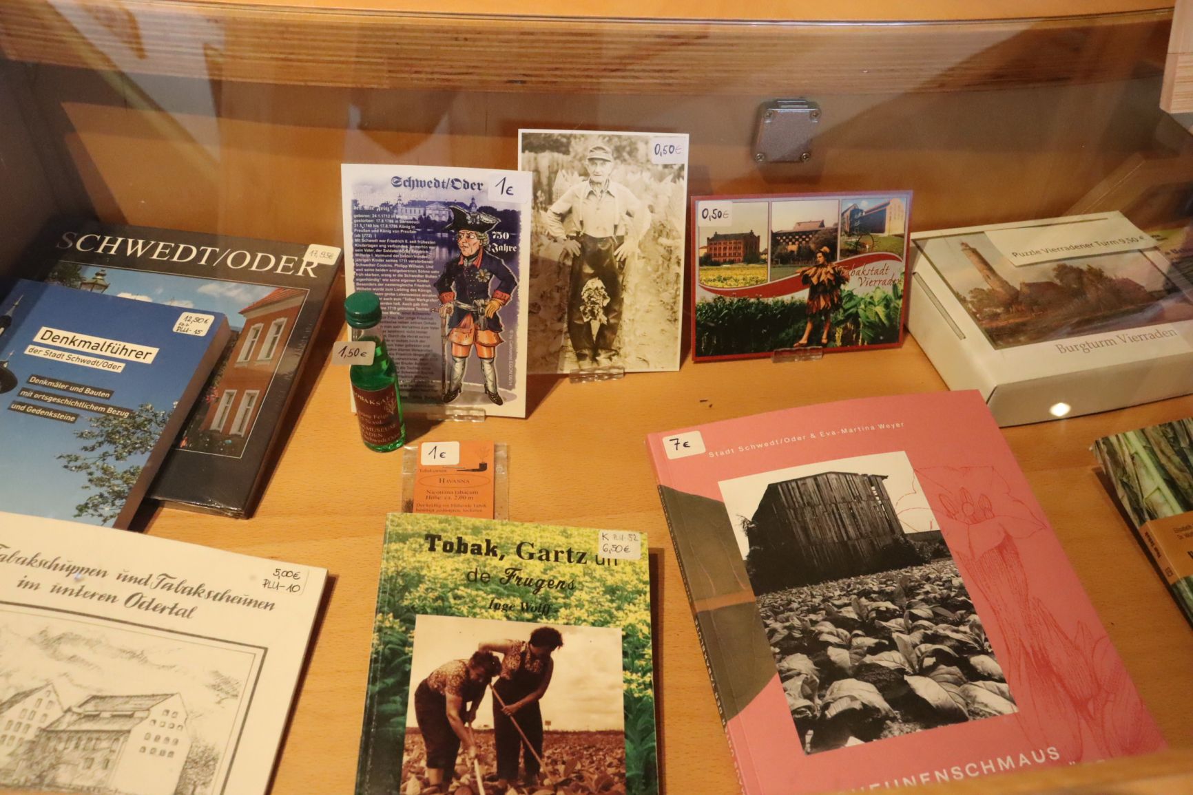 Neben den Samen bieten wir auch eine Vielzahl anderer Artikel zum Verkauf an, darunter regionale Geschichtsliteratur, Postkarten, Karten und Bücher über Tabak, Uckermark und Schwedt/Oder. Unser Museumsshop ist der ideale Ort, um ein Stück Geschichte mit nach Hause zu nehmen oder ein einzigartiges Geschenk für Ihre Lieben zu finden.