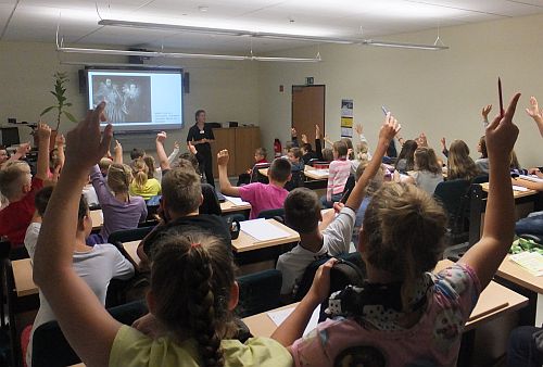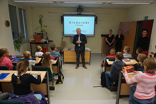 Die Begrüßung der Kinder zur 5. Schwedter KinderUni übernimmt der Bürgermeister Jürgen Polzehl höchstpersönlich im Hörsaal des Hauses der Bildung und Technologie. In der Vorlesung gab es dann Aufklärung geben, zu Fragen wie: