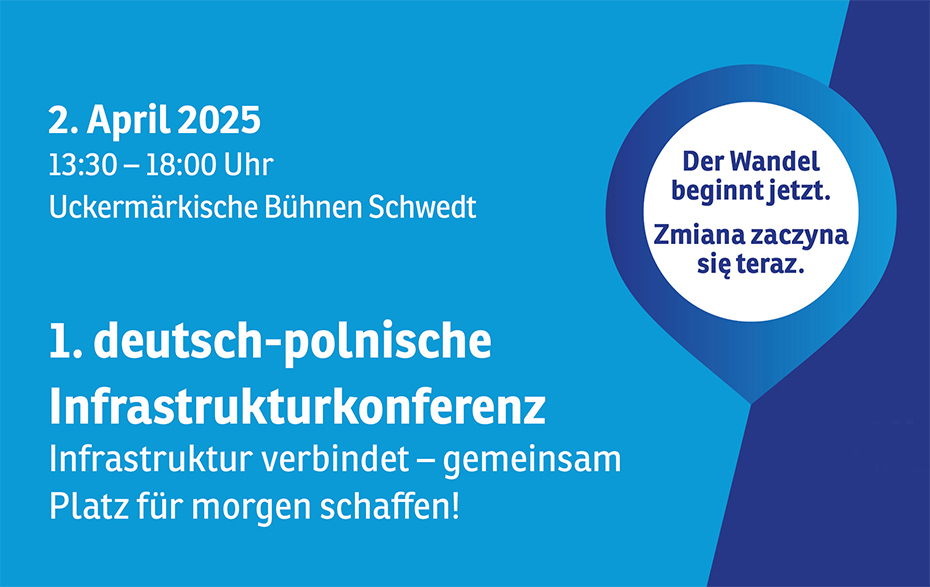 Am Mittwoch, dem 2. April 2025 findet in den Uckermärkischen Bühnen Schwedt die 1. deutsch-polnische Infrastrukturkonferenz statt. Im Rahmen der intensiven Zusammenarbeit zwischen Deutschland und Polen bietet diese Konferenz eine Plattform, um Informationen und Ideen zur zukünftigen Infrastrukturentwicklung auf der Achse Berlin – Szczecin und in der Euroregion Pomerania zu erhalten und sich auszutauschen.