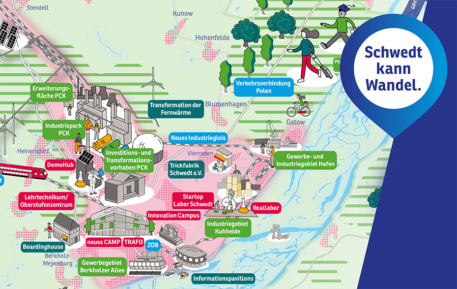 Das Konzept verbreitet jedoch nicht nur Zuversicht nach dem Motto „Wenn die Transformation gelingt, dann in Schwedt“. Es benennt auch deutlich, was nicht in der Hand von Schwedt liegt, zum Beispiel die drängende Frage der Eigentümerstruktur der PCK oder Investitionen in technische und verkehrliche Infrastruktur außerhalb der Stadtgrenzen. Da setzt die Stadt auf die tatkräftige Unterstützung ihrer Partner beim Bund und bei der Landesregierung.