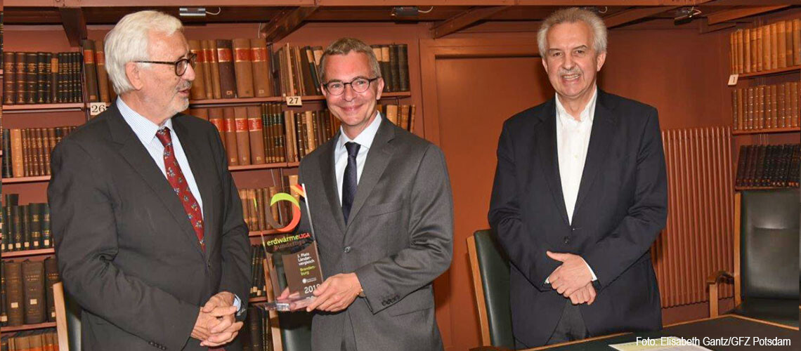 Erwin Knapek, der Präsident des Bundesverbandes Geothermie, überreicht Wirtschafts- und Energieminister Albrecht Gerber die Auszeichnung der Erwärme-Liga. Auch Reinhard Hüttl, der Leiter des Geoforschungszentrums Potsdam gratuliert. (v.l.n.r.). Foto: Elisabeth Gantz/GFZ Potsdam
