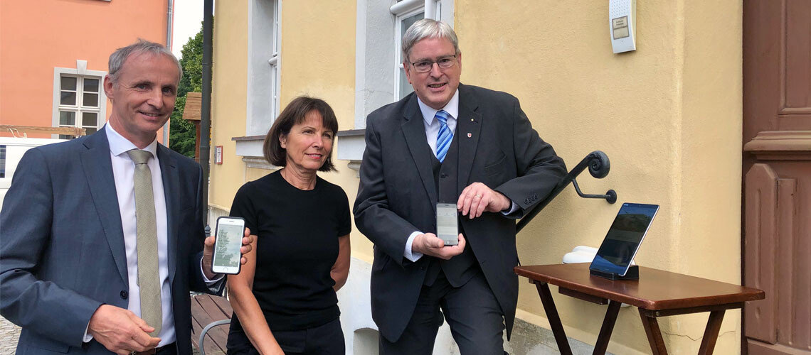 Beim Freischalten des ersten vom Land Brandenburg finanzierten öffentlichen WLAN-Hotspots in Drebkau (v.r.): Wirtschaftsminister Jörg Steinbach, Vofafone-Bereichsleiterin Gabriele Kossack und Drebkaus Bürgermeister Paul Köhne. Foto: MWE