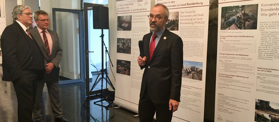 1989 wurden 230.000 Hektar Fläche militärisch genutzt – rund acht Prozent der Landesfläche. 260.000 Soldaten lebten in den Kasernen und Wohnanlagen in Brandenburg. Nach dem Abzug der ehemals sowjetischen Truppen 1994 galt es, eine neue Nutzung für die Flächen zu finden. „Brandenburg hat sich dieser großen Herausforderung mit Erfolg gestellt. Nur noch wenige der 100.000 Hektar Militärflächen, die Brandenburg 1994 vom Bund übernahm, sind ungenutzt“, so Steinbach. Allerdings würden die verbliebenen Areale die Konversionsakteure vor anspruchsvolle Aufgaben stellen. „Sei es, weil es sich um Truppenübungsplätze handelt, die mit Munition und Altlasten kontaminiert sind. Sei es, weil es unter Denkmalschutz stehende Gebäude- und Flächenensembles sind.“ Als Beispiele nannte der Minister den ehemaligen Schießplatz Kummersdorf-Gut und den Flugplatz Jüterbog-Damm.