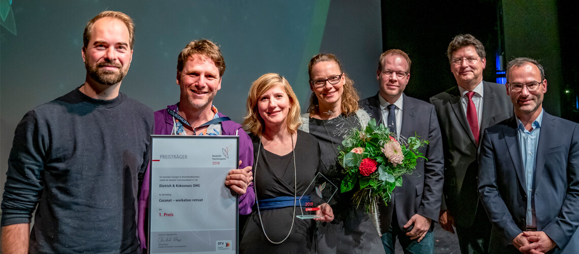 Potsdam, 22. November 2019. Das Coworking-Projekt „Coconat – A workation retreat“ wurde gestern Abend in Rostock mit dem 1. Platz des Deutschen Tourismuspreises ausgezeichnet. Insgesamt wurden 72 Bewerbungen für den Wettbewerb eingereicht. Eine Jury aus Tourismusexperten und Fachjournalisten wählte die Preisträger nach den Kriterien Innovationsgrad, Qualität & Kundenorientierung, Wirtschaftlichkeit sowie Nachhaltigkeit aus. Der Deutsche Tourismusverband e.V. (DTV) verleiht den Innovationspreis seit 2015 für zukunftsweisende Produkte und Projekte im Deutschlandtourismus. Bereits im letzten Jahr gehörte Brandenburg mit dem ContentNetzwerk der TMB Tourismus-Marketing Brandenburg und der Flämingschmiede des Tourismusverbandes Fläming zu den großen Gewinnern des Preises.