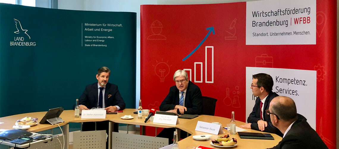 Potsdam, 12. Juni 2020. Brandenburgs Wirtschaftsminister Prof. Dr.-Ing. Jörg Steinbach und die Geschäftsführung der Wirtschaftsförderung Brandenburg (WFBB) blicken trotz der Corona-Pandemie zuversichtlich auf die Entwicklung des Wirtschafts­standorts Brandenburg. „Wir bearbeiten derzeit mehrere höchst spannende Investorenanfragen und Innovationsprojekte“, sagen die WFBB-Geschäftsführer Dr. Steffen Kammradt und Sebastian Saule.