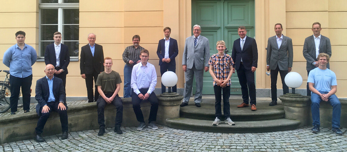 Potsdam, 2. September 2020. Energieminister Jörg Steinbach und Harald Jahnke, Vorsitzender der Landesgruppe Berlin-Brandenburg des Verbands kommunaler Unternehmen (VKU), haben heute vier Brandenburger Schülerprojekte für ihre hervorragenden Leistungen im Energiebereich beim Wettbewerb „Jugend forscht“ mit einem Sonderpreis ausgezeichnet. Die Preisträger sind die Schüler Johannes Gnilke und Tim Liesk mit ihrem Projekt „Energieeffizienz erlebbar gemacht“, Edvard Ageev und Tim Wendler mit einer intelligenten Ladestation, Hugo Frackowiak und Moritz Vogt mit dem Projekt „Simultanschaltung von Elektromotoren“ sowie Julian Zinzen mit seiner Erfindung einer Windpowerbank. Die Preisgelder von insgesamt 6.000 Euro kommen den jeweiligen Schulen oder den außerschulischen Einrichtungen zu Gute, die die Schüler bei ihren Arbeiten unterstützt haben.