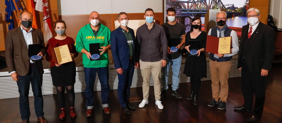 Wirtschaftsminister Jörg Steinbach zeichnet das Schlossgut Altlandsberg, die My Molo GmbH, die Hikanoe GmbH und das Brauwerk Schwedt für ihre besonderen Ideen in Corona-Zeiten aus.