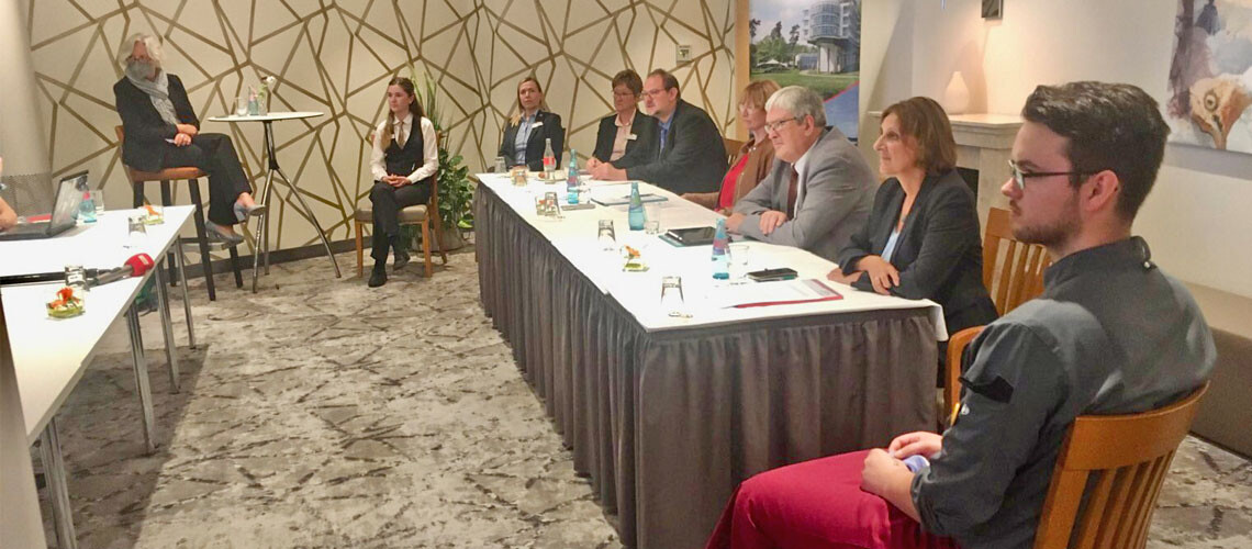Positive Signale zeigen sich auch im Hotel- und Gaststättenbereich. Die Touristikbranche in Brandenburg gewinnt zunehmend an Dynamik; die Arbeitskräftenachfrage steigt durch die Erholung der wirtschaftlichen Entwicklung in diesen Bereichen deutlich an. Dies ist eine gute Gelegenheit für Brandenburger Unternehmen, ihre Ressourcen weiter in das Thema Ausbildung zu packen. Eines dieser engagierten Unternehmen und zugleich Gastgeber der Pressekonferenz ist das Kongresshotel Potsdam am Templiner See. Das Kongresshotel bildet aktuell 35 Auszubildende in sechs unterschiedlichen Berufsfeldern der Hotellerie und Gastronomie aus.