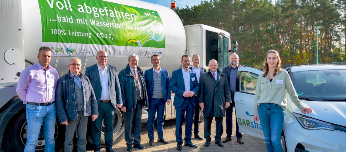 Eberswalde, 3. November 2022. Wirtschaftsminister Jörg Steinbach hat heute drei Zuwendungsbescheide in Höhe von insgesamt nahezu 9,2 Millionen Euro für das Vorhaben H2BAR übergeben. Mit der Umsetzung dieses Vorhabens wird ein erstes regionales Cluster im Bereich grüner Wasserstoffmobilität in Nord-Ost-Brandenburg realisiert. Steinbach bezeichnete H2BAR als „ein Paradebeispiel der Sektorkopplung“, mit dem die Energiewende kräftig vorangetrieben werde. Der Minister setzt sich seit Jahren für das hürdenreiche Projekt zur Umstellung des Schienenpersonennahverkehrs auf der Heidekrautbahnlinie auf Wasserstoff-Brennstoffzellenzüge ein.