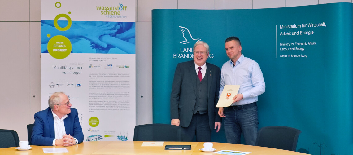 Minister Steinbach hat heute die letzten zwei ausstehenden Förderbescheide über rund vier Millionen Euro überreicht. Rund 2,5 Millionen Euro erhält die Niederbarnimer Eisenbahn AG (NEB) für die erforderlichen Begleitmaßnahmen, wie den Werkstattumbau und die Beschaffung eines Erstausstatter-Ersatzteilpakets, welche für den sicheren und reibungslosen Betrieb bei der Umstellung auf wasserstoffbetriebene Züge notwendig sind. Auf gut 1,5 Millionen Euro beläuft sich der Zuwendungsbescheid für die Barnimer Energiebeteiligungsgesellschaft mbH (BEBG), um eine Wasserstofftankstelle zur Versorgung der Straßenfahrzeuge (Busse und Abfallsammelfahrzeuge) zu errichten.