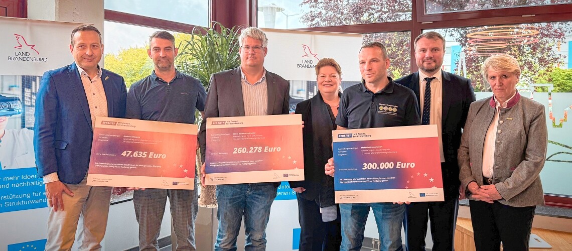 Schwedt/Oder, 24. Juli 2025. Wirtschaftsminister Daniel Keller hat heute im Neuen Camp in Schwedt/Oder in Anwesenheit von Kerstin Jöntgen, Vorständin der Investitionsbank des Landes Brandenburg (ILB), die ersten drei Zuwendungsbescheide zur JTF-Unternehmensförderung Uckermark für insgesamt 607.912 Euro überreicht. Innerhalb weniger Wochen wurden von Unternehmen aus der Uckermark bereits 31 Anträge gestellt – die Unternehmensförderung Uckermark nimmt damit weiter Fahrt auf. Gefördert werden die Druckerei Wippold für die Anschaffung einer neuen digitalen Druckmaschine, die Matthias Busse GmbH für die Erweiterung des Maschinenparks und die BLOM Deutschland GmbH für die Anschaffung von Hard- und Software zur Ausweitung des Dienstleistungsangebotes.